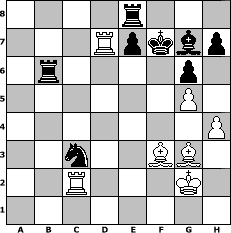 game notation in PGN-format [Event "Ranglistenturnier DWZ 1800 bis 2380 Gr.A"] [Site "www.myChess.de"] [Date "2015.03.09"] [Round "1"] [White "jeremyt"] [Black "woern63"] [ECO "B01"] [WhitemyELO "2074"] [BlackmyELO "1931"] [Result "1/2-1/2"] [TimeControl "10/2592000"] [WhiteDays "21"] [BlackDays "24"] [MyChessNo "98473"] 1. e4 d5 2. exd5 Qxd5 3. Nc3 Qa5 4. d4 c6 5. Bd2 Bf5 6. Qe2 Bxc2 7. Rc1 Bg6 8. Nh3 Nf6 9. Nf4 Qd8 10. d5 Bf5 11. g3 g6 12. Bg2 Bg7 13. O-O O-O 14. Rfd1 Bg4 15. f3 Bf5 16. Be3 Qa5 17. g4 Bc8 18. g5 Nxd5 19. Nfxd5 cxd5 20. Nxd5 Nc6 21. b4 Qa3 22. f4 Be6 23. Rd3 Qa4 24. Qd1 Qxd1+ 25. Rcxd1 Bxd5 26. Rxd5 Nxb4 27. Rd7 Nxa2 28. Bxb7 Nc3 29. R1d2 Rae8 30. Bxa7 f6 31. Kg2 fxg5 32. fxg5 Rf5 33. Be3 Kf7 34. h4 Ra5 35. Rc2 Rb8 36. Bf4 Re8 37. Bg3 Rb5 38. Bc6 Rb6 39. Bf3 1/2-1/2 position notation in FEN-format 4r3/3Rpkbp/1r4p1/6P1/7P/2n2BB1/2R3K1/8 - - - 10 39 Captured white pieces: Captured black pieces: Click on a captured piece in order to display the desired move!