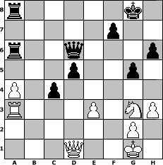 game notation in PGN-format [Event "Weihnachtsturnier 2011"] [Site "www.myChess.de"] [Date "2011.12.08"] [Round "1"] [White "Seneca"] [Black "Helmut48"] [ECO "E60"] [WhitemyELO "1431"] [BlackmyELO "1868"] [Result "0-1"] [TimeControl "10/2592000"] [WhiteDays "28"] [BlackDays "30"] [MyChessNo "78001"] 1. d4 Nf6 2. c4 g6 3. e3 Bg7 4. Nf3 c5 5. d5 d6 6. Nc3 e6 7. e4 exd5 8. exd5 O-O 9. Bd3 Re8+ 10. Be2 Bf5 11. O-O Na6 12. Bg5 h6 13. Be3 Ne4 14. a3 Bxc3 15. bxc3 Nxc3 16. Qd2 Nxe2+ 17. Qxe2 Qf6 18. Qd2 g5 19. h3 Nc7 20. Rab1 Bxb1 21. Rxb1 b5 22. cxb5 Qg6 23. Rb2 Qf5 24. a4 Nxd5 25. Nh2 Nxe3 26. fxe3 Qe6 27. Nf1 c4 28. Rc2 d5 29. Rc3 a6 30. bxa6 Rxa6 31. Qd1 Rea8 32. Ra3 Qc6 33. Ng3 Qd6 0-1 position notation in FEN-format r5k1/5p2/r2q3p/3p2p1/P1p5/R3P1NP/6P1/3Q2K1 - - - 6 34 Captured white pieces: Captured black pieces: Click on a captured piece in order to display the desired move!