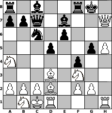 game notation in PGN-format [Event "Sibirk"] [Site "www.myChess.de"] [Date "2004.12.27"] [Round "1"] [White "Knight"] [Black "OwainGwynedd"] [ECO "A00"] [WhitemyELO "1149"] [BlackmyELO "1225"] [Result "1-0"] [TimeControl "10/2592000"] [WhiteDays "58"] [BlackDays "58"] [MyChessNo "9067"] 1. Nc3 c5 2. d4 cxd4 3. Qxd4 Nc6 4. Qh4 Nf6 5. Nf3 e6 6. Bd2 Be7 7. O-O-O O-O 8. e4 Nxe4 9. Qxe4 Qb6 10. Na4 Qc7 11. Bd3 g6 12. h4 f6 13. h5 f5 14. Qe3 f4 15. Qe2 g5 16. Qe4 d5 17. Qxh7# 1-0 position notation in FEN-format r1b2rk1/ppq1b2Q/2n1p3/3p2pP/N4p2/3B1N2/PPPB1PP1/1NKR3R - - - 0 17 Captured white pieces: Captured black pieces: Click on a captured piece in order to display the desired move!