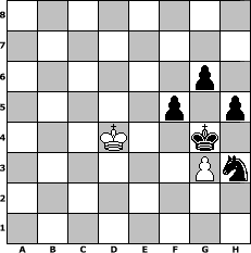 game notation in PGN-format [Event "Adventszeit"] [Site "www.myChess.de"] [Date "2022.11.28"] [Round "1"] [White "Master1"] [Black "Mynona"] [ECO "D00"] [WhitemyELO "1305"] [BlackmyELO "1414"] [Result "0-1"] [TimeControl "10/1728000"] [WhiteDays "20"] [BlackDays "20"] [MyChessNo "128289"] 1. d4 d5 2. e3 Bf5 3. Bd3 Bxd3 4. Qxd3 e6 5. Nf3 a6 6. Nbd2 f6 7. O-O c5 8. dxc5 Bxc5 9. a3 Qc7 10. Re1 b5 11. b4 Ba7 12. Nf1 Ne7 13. Bb2 Nbc6 14. h3 O-O-O 15. Bd4 e5 16. Bxa7 Qxa7 17. c3 e4 18. Qd1 exf3 19. Qxf3 Qd7 20. e4 dxe4 21. Qxe4 Qd3 22. Qg4+ Nf5 23. Rad1 Qc2 24. Rxd8+ Kxd8 25. Qf3 Ne5 26. Qa8+ Ke7 27. Qxh8 Qxc3 28. Rd1 h6 29. Qd8+ Kf7 30. Qa5 Qc6 31. Qd8 Nh4 32. Qd5+ Qxd5 33. Rxd5 Nc4 34. Rh5 Ng6 35. Rc5 Nxa3 36. Ne3 Ne5 37. Nc2 Nac4 38. f4 Nd3 39. Rc7+ Kg6 40. Ra7 Nxf4 41. Rxa6 h5 42. Kf2 Kf5 43. Nd4+ Ke4 44. Nxb5 Nd3+ 45. Ke2 Nxb4 46. Re6+ Kf5 47. Nd4+ Kg6 48. Re8 Nd5 49. Kd3 Ne5+ 50. Ke4 Nc3+ 51. Ke3 Nd5+ 52. Ke2 Nf4+ 53. Kf1 Kg5 54. Ne6+ Nxe6 55. Rxe6 g6 56. Kf2 Nd3+ 57. Ke3 Nf4 58. Kf3 Nxe6 59. g3 Kh6 60. Ke4 Ng5+ 61. Kd5 Nxh3 62. Ke6 f5 63. Ke5 Kg5 64. Kd4 Kg4 0-1 position notation in FEN-format 8/8/6p1/5p1p/3K2k1/6Pn/8/8 - - - 4 65 Captured white pieces: Captured black pieces: Click on a captured piece in order to display the desired move!