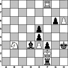game notation in PGN-format [Event "Friends 3"] [Site "www.myChess.de"] [Date "2007.04.13"] [Round "2"] [White "rikilatic"] [Black "Baehr008"] [ECO "A80"] [WhitemyELO "1580"] [BlackmyELO "2153"] [Result "0-1"] [TimeControl "10/864000"] [WhiteDays "10"] [BlackDays "10"] [MyChessNo "34075"] 1. d4 f5 2. Qd3 d5 3. Nf3 e6 4. Nc3 c5 5. Bg5 Be7 6. Bxe7 Qxe7 7. dxc5 Nf6 8. b4 a5 9. Ne5 axb4 10. Qb5+ Nbd7 11. Nxd7 Bxd7 12. Qxb4 O-O 13. e3 Rfc8 14. Bd3 Qxc5 15. Qxc5 Rxc5 16. Ne2 e5 17. c3 Ne4 18. Bxe4 dxe4 19. O-O Bb5 20. Rfe1 Ra3 21. Ng3 g6 22. Rec1 Bd3 23. h4 b5 24. h5 Kf7 25. h6 Kf6 26. Nf1 Kg5 27. Nd2 Rcxc3 28. Rxc3 Rxc3 29. a4 bxa4 30. Rxa4 Rc1+ 31. Kh2 Rc2 32. Nb3 Rxf2 33. Ra7 f4 34. Rxh7 f3 35. Rh8 Kg4 36. Rg8 Rxg2+ 37. Kh1 Kh3 38. Rf8 Re2 39. Kg1 Re1+ 40. Kf2 Rf1# 0-1 position notation in FEN-format 5R2/8/6pP/4p3/4p3/1N1bPp1k/5K2/5r2 - - - 8 41 Captured white pieces: Captured black pieces: Click on a captured piece in order to display the desired move!