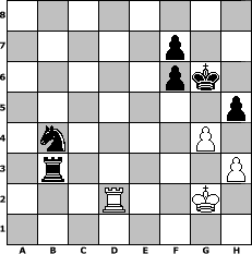 game notation in PGN-format [Event "Unter 1501"] [Site "www.myChess.de"] [Date "2020.08.24"] [Round "1"] [White "lotchi"] [Black "gunni50"] [ECO "C26"] [WhitemyELO "1175"] [BlackmyELO "1241"] [Result "0-1"] [TimeControl "10/2592000"] [WhiteDays "148"] [BlackDays "078"] [MyChessNo "119092"] 1. e4 e5 2. Nc3 Nf6 3. Nf3 Bc5 4. h3 O-O 5. a3 a5 6. Bc4 c6 7. d3 b5 8. Ba2 b4 9. axb4 axb4 10. Ne2 h6 11. c4 bxc3 12. bxc3 d5 13. d4 exd4 14. exd5 dxc3 15. dxc6 Qxd1+ 16. Kxd1 Rd8+ 17. Ke1 c2 18. Nc3 Bb4 19. Bd2 Re8+ 20. Kf1 Ba6+ 21. Kg1 Bxc3 22. Bxc3 Nxc6 23. Bxf6 gxf6 24. Ne1 Nb4 25. g4 Rac8 26. Bb3 c1=Q 27. Rxc1 Rxc1 28. Kg2 Bb7+ 29. f3 Rexe1 30. Rxe1 Bxf3+ 31. Kxf3 Rc3+ 32. Kg2 Rxb3 33. Re8+ Kg7 34. Re4 Kg6 35. Rf4 Nd5 36. Rd4 Ne3+ 37. Kf2 Nc2 38. Rd2 Nb4 39. Kg2 h5 0-1 position notation in FEN-format 8/5p2/5pk1/7p/1n4P1/1r5P/3R2K1/8 - - - 0 40 Captured white pieces: Captured black pieces: Click on a captured piece in order to display the desired move!