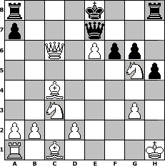 game notation in PGN-format [Event "Dabei ist alles 10"] [Site "www.myChess.de"] [Date "2010.09.12"] [Round "2"] [White "Steffi"] [Black "Zargoz"] [ECO "A42"] [WhitemyELO "1584"] [BlackmyELO "1411"] [Result "1-0"] [TimeControl "10/864000"] [WhiteDays "08"] [BlackDays "09"] [MyChessNo "68315"] 1. d4 d6 2. c4 Nf6 3. Nc3 c6 4. Nf3 Be6 5. e4 g6 6. Ng5 Qd7 7. d5 cxd5 8. cxd5 Bg4 9. f3 h5 10. Bb5 Nc6 11. fxg4 Nxg4 12. dxc6 bxc6 13. Bc4 e6 14. O-O d5 15. exd5 Bc5+ 16. Kh1 Qd6 17. g3 Nf2+ 18. Rxf2 Bxf2 19. Qf3 Bxg3 20. hxg3 Qe7 21. dxe6 f6 22. Qxc6+ 1-0 position notation in FEN-format r3k2r/p3q3/2Q1Ppp1/6Np/2B5/2N3P1/PP1P4/R1B4K - kq - 0 22 Captured white pieces: Captured black pieces: Click on a captured piece in order to display the desired move!