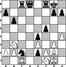 game notation in PGN-format [Event "Die Weinprobe 2017"] [Site "www.myChess.de"] [Date "2017.08.16"] [Round "1"] [White "Knight"] [Black "Gauss1233"] [ECO "A00"] [WhitemyELO "1206"] [BlackmyELO "1355"] [Result "0-1"] [TimeControl "10/1728000"] [WhiteDays "60"] [BlackDays "53"] [MyChessNo "109266"] 1. g3 d5 2. Bg2 e6 3. d4 c5 4. Nf3 Nf6 5. Nc3 Nc6 6. dxc5 Bxc5 7. O-O O-O 8. Bg5 d4 9. Ne4 e5 10. Nxc5 Qd6 11. Bxf6 Qxf6 12. Ne4 Qd8 13. h4 f5 14. Nc5 e4 15. Nh2 b6 16. Nb3 Ba6 17. Re1 Rc8 18. e3 Nb4 19. Re2 Bxe2 20. Qxe2 Nxc2 21. Rc1 d3 22. Nf1 dxe2 0-1 position notation in FEN-format 2rq1rk1/p5pp/1p6/5p2/4p2P/1N2P1P1/PPn1pPB1/2R2NK1 - - - 0 23 Captured white pieces: Captured black pieces: Click on a captured piece in order to display the desired move!