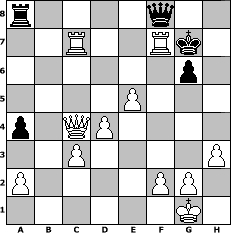 game notation in PGN-format [Event "Neues Jahr 2010"] [Site "www.myChess.de"] [Date "2010.01.01"] [Round "1"] [White "Haneken"] [Black "Master1"] [ECO "A06"] [WhitemyELO "1404"] [BlackmyELO "1270"] [Result "1-0"] [TimeControl "10/3456000"] [WhiteDays "156"] [BlackDays "157"] [MyChessNo "62006"] 1. Nf3 d5 2. d4 Nf6 3. e3 Bf5 4. c4 Nc6 5. Nc3 e6 6. cxd5 Nxd5 7. Bb5 Bd6 8. Bxc6+ bxc6 9. Bd2 Nb6 10. e4 Bg4 11. h3 Bxf3 12. Qxf3 O-O 13. e5 Bb4 14. Qg4 h6 15. Bxh6 g6 16. Bxf8 Qxf8 17. O-O Bxc3 18. bxc3 Nc4 19. Qe2 Nb6 20. Rab1 Nd5 21. Qc4 Qe8 22. Rb7 a6 23. Rfb1 Nb6 24. Qc5 Kg7 25. Rxc7 Na4 26. Qc4 Nb6 27. Rxb6 Qd8 28. Qxc6 Qe8 29. Qc4 a5 30. Rxe6 Qf8 31. Ree7 a4 32. Rxf7+ 1-0 position notation in FEN-format r4q2/2R2Rk1/6p1/4P3/p1QP4/2P4P/P4PP1/6K1 - - - 0 32 Captured white pieces: Captured black pieces: Click on a captured piece in order to display the desired move!