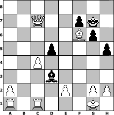 game notation in PGN-format [Event "2016"] [Site "www.myChess.de"] [Date "2016.01.01"] [Round "1"] [White "Joschi"] [Black "S04boy"] [ECO "C40"] [WhitemyELO "1564"] [BlackmyELO "1235"] [Result "1-0"] [TimeControl "10/2592000"] [WhiteDays "30"] [BlackDays "26"] [MyChessNo "101910"] 1. e4 e5 2. Nf3 d5 3. Nxe5 Bd6 4. d4 dxe4 5. Nc3 Qf6 6. Nxe4 Bxe5 7. Nxf6+ Bxf6 8. Bb5+ c6 9. Bc4 Ne7 10. O-O O-O 11. Be3 b5 12. Bd3 Rd8 13. c3 Be6 14. Qh5 g6 15. Qh6 Rd5 16. Be4 Nf5 17. Bxf5 Bxf5 18. Qf4 Nd7 19. b3 Re8 20. c4 Re4 21. Qg3 Bh4 22. Qc7 bxc4 23. bxc4 Ra5 24. Qxa5 Re8 25. Qxa7 Bd3 26. Qxd7 Re7 27. Qd8+ Kg7 28. Rfc1 Re4 29. Qc7 Re6 30. d5 Rf6 31. Bd4 Bxf2+ 32. Bxf2 h5 33. Bd4 cxd5 34. Bxf6+ 1-0 position notation in FEN-format 8/2Q2pk1/5Bp1/3p3p/2P5/3b4/P3P1PP/R1R3K1 - - - 0 34 Captured white pieces: Captured black pieces: Click on a captured piece in order to display the desired move!