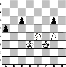 game notation in PGN-format [Event "unter uns Nr. 5"] [Site "www.myChess.de"] [Date "2012.10.15"] [Round "1"] [White "reisinger"] [Black "rux"] [ECO "D10"] [WhitemyELO "1460"] [BlackmyELO "1522"] [Result "1/2-1/2"] [TimeControl "10/864000"] [WhiteDays "10"] [BlackDays "10"] [MyChessNo "84460"] 1. d4 d5 2. c4 c6 3. Nc3 Nf6 4. Qc2 dxc4 5. e4 Qxd4 6. Be3 Qd8 7. Rd1 Qa5 8. Bxc4 Nbd7 9. Nge2 b5 10. Bxf7+ Kxf7 11. a3 e6 12. O-O Bc5 13. Bxc5 Nxc5 14. b4 Qxa3 15. bxc5 Qxc5 16. Qd3 e5 17. h3 Be6 18. Qd6 Qxd6 19. Rxd6 Rac8 20. f4 Rhd8 21. Rxd8 Rxd8 22. fxe5 Bc4 23. Rf2 b4 24. exf6 g6 25. Na4 Bxe2 26. Rxe2 Kxf6 27. Kf2 Ke5 28. Ke3 Rd4 29. Kf3 Rd3+ 30. Kf2 Ra3 31. Nb2 Rc3 32. Re3 Rxe3 33. Kxe3 b3 34. g3 Ke6 35. Kd4 h5 36. Na4 Kf6 37. Kc3 Ke5 38. Nc5 b2 39. Kxb2 Kd4 40. Nb3+ Kxe4 41. Nd2+ Ke3 42. Kc3 Kf2 43. Ne4+ Kf3 44. Kd3 a5 45. g4 hxg4 46. hxg4 1/2-1/2 position notation in FEN-format 8/8/2p3p1/p7/4N1P1/3K1k2/8/8 - - - 0 46 Captured white pieces: ![]() ![]() ![]() ![]() ![]() ![]() ![]() ![]() ![]() ![]() ![]() ![]() ![]() ![]() ![]() Captured black pieces: ![]() ![]() ![]() ![]() ![]() ![]() ![]() ![]() ![]() ![]() ![]() ![]() ![]() ![]() ![]() Click on a captured piece in order to display the desired move!