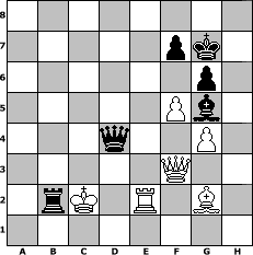 game notation in PGN-format [Event "Winteranfang 2017"] [Site "www.myChess.de"] [Date "2017.12.21"] [Round "1"] [White "Joschi"] [Black "martinus"] [ECO "B32"] [WhitemyELO "1554"] [BlackmyELO "1723"] [Result "0-1"] [TimeControl "10/3456000"] [WhiteDays "40"] [BlackDays "40"] [MyChessNo "110773"] 1. e4 c5 2. Nf3 Nc6 3. d4 cxd4 4. Nxd4 e5 5. Nb5 d6 6. N1c3 a6 7. Na3 Nf6 8. Bg5 Be7 9. Bxf6 Bxf6 10. Nd5 O-O 11. Be2 Be6 12. c4 Bxd5 13. Qxd5 Qc7 14. Qd2 Nd4 15. Nc2 Bg5 16. Qd3 b5 17. Nxd4 exd4 18. cxb5 Qa5+ 19. Kf1 axb5 20. Qxb5 Qd8 21. Qd3 Bf6 22. g3 Qb6 23. b3 Rfc8 24. Kg2 Rc3 25. Qd1 Qc6 26. Bf3 Be5 27. a4 d3 28. Rc1 Rc2 29. Rxc2 dxc2 30. Qc1 Rb8 31. Re1 Rxb3 32. Re2 Qxa4 33. Rxc2 g6 34. Rc8+ Kg7 35. Rc4 Qb5 36. Be2 d5 37. exd5 Qxd5+ 38. f3 h5 39. Rc2 Bf6 40. Rd2 Qb7 41. Qc4 Rc3 42. Qd5 Qc7 43. Rd3 Rc5 44. Qd7 Qe5 45. Rd2 h4 46. Qd6 Qe3 47. Qd3 Qh6 48. f4 hxg3 49. hxg3 Rc8 50. Bf3 Rh8 51. Kf2 Qh2+ 52. Bg2 Rd8 53. Qe3 Rb8 54. Qf3 Rb1 55. g4 Bh4+ 56. Ke2 Re1+ 57. Kd3 Qg1 58. f5 Bg5 59. Re2 Rd1+ 60. Kc2 Rc1+ 61. Kb2 Qd4+ 62. Kb3 Rb1+ 63. Kc2 Rb2# 0-1 position notation in FEN-format 8/5pk1/6p1/5Pb1/3q2P1/5Q2/1rK1R1B1/8 - - - 11 64 Captured white pieces: Captured black pieces: Click on a captured piece in order to display the desired move!