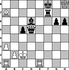 game notation in PGN-format [Event "7er5"] [Site "www.myChess.de"] [Date "2017.05.15"] [Round "1"] [White "spiderman"] [Black "alibengali"] [ECO "A28"] [WhitemyELO "1793"] [BlackmyELO "1703"] [Result "1-0"] [TimeControl "10/3456000"] [WhiteDays "35"] [BlackDays "39"] [MyChessNo "108199"] 1. c4 e5 2. Nc3 Nc6 3. Nf3 Nf6 4. d4 e4 5. Ng5 h6 6. Ngxe4 Nxe4 7. Nxe4 Qh4 8. Qd3 Nb4 9. Qb1 d5 10. cxd5 Bf5 11. Nd6+ Bxd6 12. Qxf5 g6 13. Qb1 Qxd4 14. e4 Qc5 15. Kd1 Qxf2 16. a3 Qd4+ 17. Ke2 Qc4+ 18. Ke1 Nc2+ 19. Kd1 Qd4+ 20. Kxc2 Qxe4+ 21. Kb3 Qxd5+ 22. Bc4 Qxg2 23. Re1+ Kd7 24. Qd3 Qxh2 25. Bxf7 Raf8 26. Be6+ Kd8 27. Qb5 Rf3+ 28. Be3 Rh7 29. Qxb7 Qe5 30. Qa8+ Ke7 31. Qxf3 Qxe6+ 32. Kc2 Qc4+ 33. Kd2 Rf7 34. Bxa7+ Kf8 35. Qc3 Qd5+ 36. Kc2 c5 37. Qh8# 1-0 position notation in FEN-format 5k1Q/B4r2/3b2pp/2pq4/8/P7/1PK5/R3R3 - - - 1 37 Captured white pieces: Captured black pieces: Click on a captured piece in order to display the desired move!