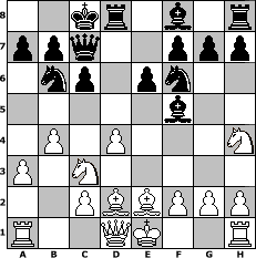 game notation in PGN-format [Event "Fernschachmeisterschaft Sfr. Heimersheim 2005"] [Site "www.myChess.de"] [Date "2005.08.06"] [Round "2"] [White "Charles@"] [Black "MisterBean"] [ECO "B01"] [WhitemyELO "1500"] [BlackmyELO "1696"] [Result "0-1"] [TimeControl "10/2592000"] [WhiteDays "31"] [BlackDays "49"] [MyChessNo "15956"] 1. e4 d5 2. exd5 Qxd5 3. Nc3 Qa5 4. d4 c6 5. Nf3 Nf6 6. Bc4 Bf5 7. Bd2 e6 8. a3 Nbd7 9. b4 Qc7 10. Nh4 Nb6 11. Be2 O-O-O 0-1 position notation in FEN-format 2kr1b1r/ppq2ppp/1np1pn2/5b2/1P1P3N/P1N5/2PBBPPP/R2QK2R - KQ - 5 12 Captured white pieces: ![]() ![]() ![]() ![]() ![]() ![]() ![]() ![]() ![]() ![]() ![]() ![]() ![]() ![]() ![]() Captured black pieces: ![]() ![]() ![]() ![]() ![]() ![]() ![]() ![]() ![]() ![]() ![]() ![]() ![]() ![]() ![]() Click on a captured piece in order to display the desired move!