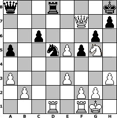 game notation in PGN-format [Event "Schlusslichterturnier Nr.2"] [Site "www.myChess.de"] [Date "2010.10.25"] [Round "1"] [White "Seneca"] [Black "Knight"] [ECO "E00"] [WhitemyELO "1483"] [BlackmyELO "1185"] [Result "1-0"] [TimeControl "10/2592000"] [WhiteDays "30"] [BlackDays "30"] [MyChessNo "69320"] 1. d4 Nf6 2. c4 e6 3. e3 Bb4+ 4. Bd2 Bxd2+ 5. Nxd2 d5 6. Ngf3 Nc6 7. Bd3 O-O 8. O-O a5 9. a3 dxc4 10. Nxc4 b5 11. Nce5 Nxe5 12. dxe5 Nd5 13. Bxb5 Ba6 14. Bxa6 Rxa6 15. h3 f5 16. Qd3 g6 17. Qxa6 Qa8 18. Qxe6+ Kh8 19. Rad1 Rd8 20. Qf7 c6 21. Ng5 1-0 position notation in FEN-format q2r3k/5Q1p/2p3p1/p2nPpN1/8/P3P2P/1P3PP1/3R1RK1 - - - 1 21 Captured white pieces: Captured black pieces: Click on a captured piece in order to display the desired move!