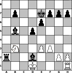 game notation in PGN-format [Event "Ferienspass"] [Site "www.myChess.de"] [Date "2016.07.25"] [Round "1"] [White "FrankB"] [Black "Cuibono"] [ECO "D02"] [WhitemyELO "1664"] [BlackmyELO "2085"] [Result "0-1"] [TimeControl "10/864000"] [WhiteDays "10"] [BlackDays "10"] [MyChessNo "104293"] 1. d4 d5 2. Nf3 c5 3. dxc5 e6 4. b4 a5 5. c3 axb4 6. cxb4 Qf6 7. Qd4 Nc6 8. Qxf6 Nxf6 9. Bd2 Ne4 10. b5 Na5 11. Bxa5 Rxa5 12. a4 Bxc5 13. e3 Bb4+ 14. Nfd2 Ke7 15. Bd3 Nc5 16. Bc2 Bd7 17. Na3 Nxa4 18. Bxa4 Rxa4 19. Nc2 Rxa1+ 20. Nxa1 Ra8 21. Nab3 Bxb5 22. f3 Ra2 23. Kd1 Bxd2 0-1 position notation in FEN-format 8/1p2kppp/4p3/1b1p4/8/1N2PP2/r2b2PP/3K3R - - - 0 24 Captured white pieces: Captured black pieces: Click on a captured piece in order to display the desired move!