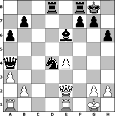 game notation in PGN-format [Event "Herbstgambit"] [Site "www.myChess.de"] [Date "2008.09.22"] [Round "1"] [White "werderfan"] [Black "murphy12"] [ECO "D32"] [WhitemyELO "1628"] [BlackmyELO "1524"] [Result "0-1"] [TimeControl "10/2592000"] [WhiteDays "90"] [BlackDays "88"] [MyChessNo "48238"] 1. d4 d5 2. c4 e6 3. Nc3 c5 4. cxd5 cxd4 5. dxe6 Bxe6 6. Ne4 Nc6 7. e3 Bb4+ 8. Bd2 dxe3 9. fxe3 Qb6 10. Bxb4 Qxb4+ 11. Qd2 Qxe4 12. Bb5 Nge7 13. Nf3 O-O 14. O-O Rad8 15. Qe2 Nf5 16. Rfe1 h6 17. a3 a6 18. Ba4 Qxa4 19. e4 Ncd4 20. Nxd4 Nxd4 0-1 position notation in FEN-format 3r1rk1/1p3pp1/p3b2p/8/q2nP3/P7/1P2Q1PP/R3R1K1 - - - 0 21 Captured white pieces: Captured black pieces: Click on a captured piece in order to display the desired move!