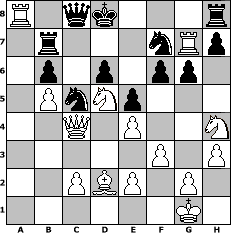 game notation in PGN-format [Event "Fair Play Turnier 2"] [Site "www.myChess.de"] [Date "2014.01.03"] [Round "1"] [White "Ziegert"] [Black "Achimkogge"] [ECO "C40"] [WhitemyELO "1525"] [BlackmyELO "1404"] [Result "0-1"] [TimeControl "10/2592000"] [WhiteDays "00"] [BlackDays "23"] [MyChessNo "92051"] 1. e4 e5 2. Nf3 f6 3. Bc4 Nh6 4. Nh4 g6 5. Qf3 d6 6. h3 Qe7 7. Nc3 c6 8. d3 Be6 9. Bd2 Bxc4 10. dxc4 Na6 11. O-O Nb4 12. Rfc1 O-O-O 13. a3 Na6 14. b4 Bg7 15. b5 cxb5 16. cxb5 Nc5 17. Nd5 Qe6 18. Qc3 b6 19. a4 Kd7 20. a5 Rb8 21. axb6 axb6 22. Ra7+ Kd8 23. Rxg7 Nf7 24. f3 Rb7 25. Ra1 Kd7 26. Qc4 Kd8 27. Ra8+ Qc8 0-1 position notation in FEN-format R1qk3r/1r3nRp/1p1p1pp1/1PnNp3/2Q1P2N/5P1P/2PBP1P1/6K1 - - - 7 28 Captured white pieces: Captured black pieces: Click on a captured piece in order to display the desired move!