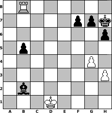 game notation in PGN-format [Event "1. mySchach Pfingst Open 2014"] [Site "www.myChess.de"] [Date "2014.06.08"] [Round "1"] [White "Grubengeist"] [Black "espero"] [ECO "C00"] [WhitemyELO "2008"] [BlackmyELO "1686"] [Result "1/2-1/2"] [TimeControl "10/3456000"] [WhiteDays "40"] [BlackDays "35"] [MyChessNo "94653"] 1. e4 e6 2. Nf3 d5 3. exd5 exd5 4. d4 Bd6 5. Be2 Nf6 6. O-O O-O 7. Re1 h6 8. c4 dxc4 9. Bxc4 Bg4 10. Nc3 Nc6 11. Be3 a6 12. h3 Bh5 13. a3 b5 14. Be2 Re8 15. Rc1 Ne7 16. Ne5 Bxe2 17. Rxe2 Nf5 18. Bf4 c5 19. dxc5 Bxc5 20. Rd2 Qb6 21. Qb3 Ra7 22. Nd5 Nxd5 23. Qxd5 Bf8 24. g4 Rxe5 25. Qxe5 Nh4 26. Qe4 Re7 27. Qc6 Qxc6 28. Rxc6 Nf3+ 29. Kg2 Nxd2 30. Bxd2 Re2 31. Bc3 Be7 32. Rxa6 Bc5 33. Rc6 Bxf2 34. Kf1 Rc2 35. Rc8+ Kh7 36. Rb8 Bc5 37. Ke1 Bxa3 38. Kd1 Rxb2 39. Bxb2 Bxb2 1/2-1/2 position notation in FEN-format 1R6/5ppk/7p/1p6/6P1/7P/1b6/3K4 - - - 0 40 Captured white pieces: Captured black pieces: Click on a captured piece in order to display the desired move!