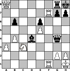 game notation in PGN-format [Event "Aljechin zum Fr"] [Site "www.myChess.de"] [Date "2005.10.21"] [Round "1"] [White "helrobe"] [Black "Knight"] [ECO "B03"] [WhitemyELO "1665"] [BlackmyELO "1259"] [Result "1-0"] [TimeControl "10/864000"] [WhiteDays "10"] [BlackDays "10"] [MyChessNo "18742"] 1. e4 Nf6 2. e5 Nd5 3. d4 d6 4. c4 Nb6 5. f4 dxe5 6. fxe5 Bf5 7. Nc3 e6 8. Nf3 Be7 9. Be2 O-O 10. O-O f6 11. Bf4 fxe5 12. Bxe5 Nc6 13. c5 Bg4 14. cxb6 axb6 15. a3 Bxf3 16. Bxf3 Nxe5 17. dxe5 Qb8 18. Qd7 Bc5+ 19. Kh1 Re8 20. Bg4 Kh8 21. Rf7 Rg8 22. Raf1 Qd8 23. Qxc7 Qd4 24. Qxb7 Qxg4 25. b4 Bd4 26. Qxa8 1-0 position notation in FEN-format Q5rk/5Rpp/1p2p3/4P3/1P1b2q1/P1N5/6PP/5R1K - - - 0 26 Captured white pieces: Captured black pieces: Click on a captured piece in order to display the desired move!