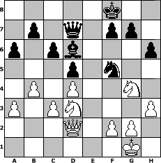 game notation in PGN-format [Event "Winterende2014"] [Site "www.myChess.de"] [Date "2014.03.06"] [Round "1"] [White "faustballer"] [Black "lasker"] [ECO "C00"] [WhitemyELO "1532"] [BlackmyELO "1155"] [Result "1-0"] [TimeControl "10/1728000"] [WhiteDays "60"] [BlackDays "00"] [MyChessNo "93382"] 1. e4 e6 2. Bc4 d5 3. exd5 exd5 4. Bb3 Nf6 5. d3 Nc6 6. Be3 Bd6 7. h3 O-O 8. Bg5 Re8+ 9. Ne2 Be6 10. Nd2 h6 11. Bxf6 Qxf6 12. Rb1 a6 13. a3 Kh8 14. c3 Bf5 15. Nf3 Ne7 16. Bc2 Rab8 17. d4 Bxc2 18. Qxc2 Nf5 19. O-O Kg8 20. Qd3 Re7 21. Nh2 Rbe8 22. Ng4 Qe6 23. Rbe1 Qd7 24. Qd2 c6 25. Nc1 Rxe1 26. Rxe1 Kf8 27. Rxe8+ Qxe8 28. Nd3 Qd7 29. b4 1-0 position notation in FEN-format 5k2/1p1q1pp1/p1pb3p/3p1n2/1P1P2N1/P1PN3P/3Q1PP1/6K1 - - - 0 29 Captured white pieces: Captured black pieces: Click on a captured piece in order to display the desired move!