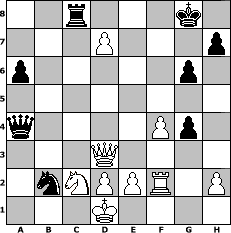 game notation in PGN-format [Event "Chess 960 qu"] [Site "www.myChess.de"] [Date "2010.01.29"] [Round "1"] [White "deepsabel"] [Black "Peterlie77 (C)"] [Variant "Fischerrandom"] [SetUp "1"] [FEN "rqknnrbb/pppppppp/8/8/8/8/PPPPPPPP/RQKNNRBB w KQkq - 0 1"] [WhitemyELO "1988"] [BlackmyELO "1856"] [Result "0-1"] [TimeControl "10/2592000"] [WhiteDays "28"] [BlackDays "29"] [MyChessNo "62733"] 1. f4 f5 2. g3 g6 3. c3 c6 4. Qc2 Nf6 5. Nf2 Qc7 6. O-O-O Qa5 7. b3 Bd5 8. Bxd5 cxd5 9. Kb1 Ne6 10. Nf3 O-O 11. Ng5 Nc7 12. Rc1 Rfc8 13. Nd1 Nb5 14. Qd3 e6 15. Bf2 Rc6 16. Nf3 Ne4 17. a4 a6 18. g4 d4 19. Bxd4 Bxd4 20. cxd4 Rxc1+ 21. Kxc1 fxg4 22. Ne1 Rc8+ 23. Nc2 Nbd6 24. Nf2 Nxf2 25. Rxf2 b5 26. d5 Qb6 27. Qe3 Qc7 28. Qd3 bxa4 29. bxa4 Qa5 30. Kd1 Qxa4 31. dxe6 Nc4 32. exd7 Nb2+ 0-1 position notation in FEN-format 2r3k1/3P3p/p5p1/8/q4Pp1/3Q4/1nNPPR1P/3K4 - - - 1 33 Captured white pieces: Captured black pieces: Click on a captured piece in order to display the desired move!