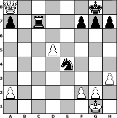 game notation in PGN-format [Event "Schachkings Miniturnier"] [Site "www.myChess.de"] [Date "2010.10.10"] [Round "1"] [White "Seneca"] [Black "alpacino"] [ECO "D20"] [WhitemyELO "1488"] [BlackmyELO "1316"] [Result "1-0"] [TimeControl "10/2592000"] [WhiteDays "25"] [BlackDays "30"] [MyChessNo "68878"] 1. d4 d5 2. c4 dxc4 3. e4 b5 4. b3 e5 5. bxc4 Bb4+ 6. Bd2 Bxd2+ 7. Qxd2 bxc4 8. d5 Nf6 9. Nc3 Ba6 10. Nf3 Nbd7 11. Be2 O-O 12. O-O Nc5 13. Nxe5 Nfxe4 14. Nxe4 Nxe4 15. Qd4 Nd6 16. Nc6 Qe8 17. Rfe1 Nf5 18. Qf4 Nd6 19. Bxc4 Bxc4 20. Rxe8 Rfxe8 21. Qf3 Be2 22. Qc3 Bb5 23. h3 Ne4 24. Qc2 Bxc6 25. Qxc6 Rec8 26. Rb1 Nd2 27. Rb7 Ne4 28. Rxc7 Rxc7 29. Qxa8+ 1-0 position notation in FEN-format Q5k1/p1r2ppp/8/3P4/4n3/7P/P4PP1/6K1 - - - 0 29 Captured white pieces: Captured black pieces: Click on a captured piece in order to display the desired move!
