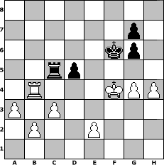 game notation in PGN-format [Event "Windecker Herbst-Open"] [Site "www.myChess.de"] [Date "2014.10.08"] [Round "1"] [White "espero"] [Black "Joschi"] [ECO "B10"] [WhitemyELO "1764"] [BlackmyELO "1589"] [Result "1-0"] [TimeControl "10/1728000"] [WhiteDays "20"] [BlackDays "20"] [MyChessNo "96184"] 1. e4 c6 2. d3 e5 3. f4 exf4 4. Bxf4 d5 5. Nc3 dxe4 6. dxe4 Qxd1+ 7. Rxd1 Bb4 8. Bc4 Bg4 9. Rd3 Nf6 10. h3 Bh5 11. Nf3 O-O 12. O-O Bxc3 13. Rxc3 Nxe4 14. Re3 Nf6 15. Ne5 Nd5 16. Bxd5 cxd5 17. g4 Bg6 18. Nxg6 hxg6 19. Re7 b6 20. Bxb8 Raxb8 21. Rxa7 Ra8 22. Rfxf7 Rxf7 23. Rxa8+ Kh7 24. Rd8 Rc7 25. c3 Rc5 26. Kf2 Kh6 27. Kg3 Kg5 28. h4+ Kf6 29. Rd6+ Kf7 30. Rxb6 Ra5 31. a3 Rc5 32. Rb4 Kf6 33. Kf4 1-0 position notation in FEN-format 8/6p1/5kp1/2rp4/1R3KPP/P1P5/1P2P3/8 - - - 4 33 Captured white pieces: Captured black pieces: Click on a captured piece in order to display the desired move!