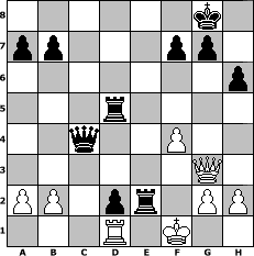 game notation in PGN-format [Event "lockeres Schachturnier"] [Site "www.myChess.de"] [Date "2003.10.04"] [Round "2"] [White "salmo"] [Black "baltruma"] [ECO "C42"] [WhitemyELO "1477"] [BlackmyELO "1361"] [Result "0-1"] [TimeControl "10/1728000"] [WhiteDays "38"] [BlackDays "59"] [MyChessNo "1023"] 1. e4 e5 2. Nf3 Nf6 3. d3 Bd6 4. d4 Qe7 5. Bg5 h6 6. Bxf6 Qxf6 7. Bc4 O-O 8. Nc3 exd4 9. Nxd4 Be5 10. Nde2 d6 11. O-O Bg4 12. Qd2 Nd7 13. f4 Bxc3 14. Nxc3 Nb6 15. Bb3 Rad8 16. Rab1 Rfe8 17. Qe3 d5 18. Qg3 d4 19. Nb5 Be2 20. Nxc7 Rxe4 21. Rf2 d3 22. c3 d2 23. Rxe2 Rxe2 24. Rd1 Qe7 25. Kf1 Qe4 26. c4 Nxc4 27. Nd5 Rxd5 28. Bxc4 Qxc4 0-1 position notation in FEN-format 6k1/pp3pp1/7p/3r4/2q2P2/6Q1/PP1pr1PP/3R1K2 - - - 0 29 Captured white pieces: Captured black pieces: Click on a captured piece in order to display the desired move!