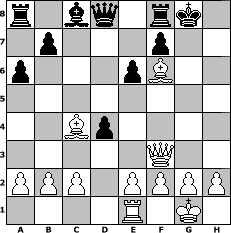 game notation in PGN-format [Event "3. HSF-Clubturnier - A-Finale"] [Site "www.myChess.de"] [Date "2013.03.16"] [Round "1"] [White "jeremyt"] [Black "Gauss1233"] [ECO "B01"] [WhitemyELO "2031"] [BlackmyELO "1436"] [Result "1-0"] [TimeControl "10/2592000"] [WhiteDays "30"] [BlackDays "28"] [MyChessNo "87180"] 1. e4 d5 2. exd5 Qxd5 3. Nc3 Qd8 4. Bc4 e6 5. Nf3 Nf6 6. O-O Bc5 7. d4 Bb6 8. Bg5 O-O 9. Ne4 Nbd7 10. Re1 h6 11. Bh4 g5 12. Nfxg5 hxg5 13. Bxg5 a6 14. Qf3 Bxd4 15. Rad1 c5 16. Nxf6+ Nxf6 17. Rxd4 cxd4 18. Bxf6 1-0 position notation in FEN-format r1bq1rk1/1p3p2/p3pB2/8/2Bp4/5Q2/PPP1PPPP/4R1K1 - - - 0 18 Captured white pieces: ![]() ![]() ![]() ![]() ![]() ![]() ![]() ![]() ![]() ![]() ![]() ![]() ![]() ![]() ![]() Captured black pieces: ![]() ![]() ![]() ![]() ![]() ![]() ![]() ![]() ![]() ![]() ![]() ![]() ![]() ![]() ![]() Click on a captured piece in order to display the desired move!