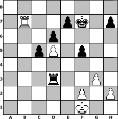 game notation in PGN-format [Event "F"] [Site "www.myChess.de"] [Date "2005.03.08"] [Round "1"] [White "Sanji"] [Black "Dragonwolves"] [ECO "A58"] [WhitemyELO "1438"] [BlackmyELO "1969"] [Result "0-1"] [TimeControl "10/1728000"] [WhiteDays "76"] [BlackDays "60"] [MyChessNo "10992"] 1. d4 Nf6 2. c4 c5 3. d5 b5 4. cxb5 a6 5. bxa6 g6 6. g3 Bg7 7. Bg2 d6 8. Nc3 Bxa6 9. Nf3 Nbd7 10. O-O O-O 11. Re1 Nb6 12. e4 Nfd7 13. Qc2 Nc4 14. Nd2 Nde5 15. Nxc4 Nxc4 16. Bd2 Qa5 17. Bf1 Nxd2 18. Qxd2 Bxf1 19. Rxf1 Rfb8 20. a3 Rb3 21. Rfe1 Rxb2 22. Qxb2 Bxc3 23. Qc1 Bxe1 24. Qxe1 Qxe1+ 25. Rxe1 Rxa3 26. Rb1 f5 27. Rb7 Kf7 28. exf5 gxf5 29. Kf1 Rd3 0-1 position notation in FEN-format 8/1R2pk1p/3p4/2pP1p2/8/3r2P1/5P1P/5K2 - - - 2 30 Captured white pieces: Captured black pieces: Click on a captured piece in order to display the desired move!
