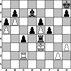 game notation in PGN-format [Event "Rechnerfrei A"] [Site "www.myChess.de"] [Date "2010.02.05"] [Round "1"] [White "Master1"] [Black "beowulf"] [ECO "D02"] [WhitemyELO "1205"] [BlackmyELO "1314"] [Result "0-1"] [TimeControl "10/1728000"] [WhiteDays "77"] [BlackDays "79"] [MyChessNo "62914"] 1. d4 d5 2. Nf3 Nf6 3. Nc3 e6 4. Bf4 c5 5. e3 c4 6. h3 Bb4 7. Be2 O-O 8. O-O Nbd7 9. Qd2 Ne4 10. Qe1 Qa5 11. Ne5 Nxe5 12. Bxe5 Nxc3 13. f3 Nxe2+ 14. Qxe2 f6 15. Bg3 Bd7 16. c3 Be7 17. e4 Rae8 18. e5 f5 19. f4 g5 20. b4 Qd8 21. a4 Kh8 22. Bh2 Rg8 23. b5 gxf4 24. Bxf4 Bg5 25. Bxg5 Rxg5 26. Qb2 Reg8 27. Rf2 Rg3 28. Ra2 Qg5 29. a5 Qe3 30. Qd2 Qxd2 31. Rfxd2 Rxc3 32. b6 a6 33. Kf1 Rgg3 34. Rac2 Rxc2 35. Rxc2 Rd3 36. Ke2 Rxd4 37. Ke3 Re4+ 0-1 position notation in FEN-format 7k/1p1b3p/pP2p3/P2pPp2/2p1r3/4K2P/2R3P1/8 - - - 2 38 Captured white pieces: Captured black pieces: Click on a captured piece in order to display the desired move!