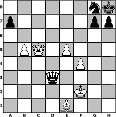 game notation in PGN-format [Event "FSO1-1-45"] [Site "www.myChess.de"] [Date "2005.05.26"] [Round "2"] [White "Bolligru"] [Black "Dragonwolves"] [ECO "E10"] [WhitemyELO "1540"] [BlackmyELO "2010"] [Result "1/2-1/2"] [TimeControl "10/2592000"] [WhiteDays "10"] [BlackDays "29"] [MyChessNo "13599"] 1. d4 Nf6 2. c4 e6 3. Nf3 d5 4. g3 dxc4 5. Bg2 c5 6. O-O Be7 7. Na3 Nc6 8. dxc5 O-O 9. Nxc4 Bxc5 10. Nfe5 Nd5 11. Nxc6 bxc6 12. a3 Qf6 13. Rb1 Ba6 14. Qc2 Rab8 15. Nd2 Bb6 16. Ne4 Qg6 17. b4 f5 18. Nd6 Bc7 19. Nc4 f4 20. Be4 Qh5 21. Bf3 Qg6 22. Be4 Qh6 23. Rb3 Rbd8 24. a4 Rb8 25. Bd2 Rfd8 26. Bf3 Qf6 27. Rfb1 Rf8 28. b5 cxb5 29. axb5 Bb7 30. Na5 fxg3 31. hxg3 Bxa5 32. Bxa5 Qf7 33. Be1 Nf6 34. Bc6 Rbc8 35. Rc3 Rc7 36. e4 Kh8 37. f3 Ng8 38. f4 Qg6 39. e5 Qg4 40. Qg2 Qg6 41. Rd1 Bxc6 42. Rxc6 Rb7 43. Rxe6 Qxe6 44. Qxb7 Rxf4 45. gxf4 Qg4+ 46. Kf2 Qxd1 47. Qe4 Qb3 48. Qc6 Qd3 49. Qc5 1/2-1/2 position notation in FEN-format 6nk/p5pp/8/1PQ1P3/5P2/3q4/5K2/4B3 - - - 5 49 Captured white pieces: Captured black pieces: Click on a captured piece in order to display the desired move!