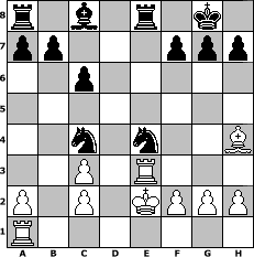 game notation in PGN-format [Event "Gl"] [Site "www.myChess.de"] [Date "2015.06.30"] [Round "1"] [White "MiFie"] [Black "Gauss1233"] [ECO "B01"] [WhitemyELO "1053"] [BlackmyELO "1391"] [Result "0-1"] [TimeControl "10/2592000"] [WhiteDays "51"] [BlackDays "59"] [MyChessNo "99583"] 1. e4 d5 2. d3 dxe4 3. dxe4 Qxd1+ 4. Kxd1 Nf6 5. Nc3 e5 6. Nf3 Bc5 7. Nxe5 c6 8. Bc4 O-O 9. Ke2 Bd4 10. Rd1 Bxe5 11. Bg5 Bxc3 12. bxc3 Nxe4 13. Be7 Re8 14. Rd3 Nd7 15. Bh4 Ne5 16. Re3 Nxc4 0-1 position notation in FEN-format r1b1r1k1/pp3ppp/2p5/8/2n1n2B/2P1R3/P1P1KPPP/R7 - - - 0 17 Captured white pieces: Captured black pieces: Click on a captured piece in order to display the desired move!