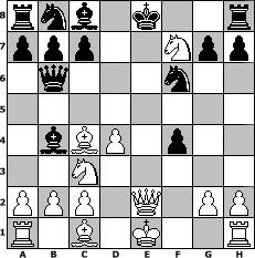 game notation in PGN-format [Event "Pfingst -Turnier"] [Site "www.myChess.de"] [Date "2009.05.30"] [Round "1"] [White "Caligula"] [Black "Steppenwolf"] [ECO "C36"] [WhitemyELO "1264"] [BlackmyELO "1217"] [Result "1-0"] [TimeControl "10/2592000"] [WhiteDays "60"] [BlackDays "42"] [MyChessNo "56168"] 1. e4 e5 2. f4 exf4 3. Nf3 d5 4. exd5 Qxd5 5. Nc3 Qc6 6. Ne5 Qe6 7. d4 Nf6 8. Bc4 Qb6 9. Qe2 Bb4 10. Nxf7+ 1-0 position notation in FEN-format rnb1k2r/ppp2Npp/1q3n2/8/1bBP1p2/2N5/PPP1Q1PP/R1B1K2R - KQkq - 0 10 Captured white pieces: ![]() ![]() ![]() ![]() ![]() ![]() ![]() ![]() ![]() ![]() ![]() ![]() ![]() ![]() ![]() Captured black pieces: ![]() ![]() ![]() ![]() ![]() ![]() ![]() ![]() ![]() ![]() ![]() ![]() ![]() ![]() ![]() Click on a captured piece in order to display the desired move!