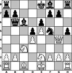 game notation in PGN-format [Event "Fernschachmeisterschaft Sfr. Heimersheim 2005"] [Site "www.myChess.de"] [Date "2005.08.06"] [Round "1"] [White "Charles@"] [Black "stefan"] [ECO "C02"] [WhitemyELO "1500"] [BlackmyELO "1782"] [Result "0-1"] [TimeControl "10/2592000"] [WhiteDays "31"] [BlackDays "52"] [MyChessNo "15934"] 1. e4 e6 2. d4 d5 3. e5 c5 4. c3 Nc6 5. Bb5 Bd7 6. Bxc6 Bxc6 7. Qh5 cxd4 8. cxd4 Qb6 9. Ne2 Ne7 10. Nbc3 Nf5 11. Qg4 h5 0-1 position notation in FEN-format r3kb1r/pp3pp1/1qb1p3/3pPn1p/3P2Q1/2N5/PP2NPPP/R1B1K2R - KQkq - 0 12 Captured white pieces: ![]() ![]() ![]() ![]() ![]() ![]() ![]() ![]() ![]() ![]() ![]() ![]() ![]() ![]() ![]() Captured black pieces: ![]() ![]() ![]() ![]() ![]() ![]() ![]() ![]() ![]() ![]() ![]() ![]() ![]() ![]() ![]() Click on a captured piece in order to display the desired move!