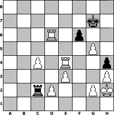 game notation in PGN-format [Event "Februar 2017"] [Site "www.myChess.de"] [Date "2017.02.05"] [Round "1"] [White "Schefsche"] [Black "alpacino"] [ECO "A01"] [WhitemyELO "1371"] [BlackmyELO "1306"] [Result "1-0"] [TimeControl "10/1728000"] [WhiteDays "86"] [BlackDays "91"] [MyChessNo "106777"] 1. b3 e6 2. Bb2 Nc6 3. a3 Nf6 4. e3 Bd6 5. Bc4 Be5 6. Bxe5 Nxe5 7. Qe2 d5 8. Bb5+ c6 9. Bd3 Bd7 10. Nf3 Nxf3+ 11. Qxf3 Qe7 12. Nc3 a6 13. O-O g6 14. h3 h5 15. b4 b5 16. a4 Qxb4 17. Rfb1 Qe7 18. axb5 O-O 19. bxa6 Nh7 20. Qf4 e5 21. Qb4 Qxb4 22. Rxb4 Be6 23. Na4 Ra7 24. Nc5 Ng5 25. Rb7 Raa8 26. a7 e4 27. Be2 Bf5 28. Nd7 Bxd7 29. Rxd7 Ne6 30. Ba6 Rxa7 31. Rxa7 Nc5 32. Rc7 Nxa6 33. Rxa6 Rb8 34. Rcxc6 h4 35. Rd6 Kg7 36. Rxd5 Rb1+ 37. Kh2 Rb2 38. c4 Rb1 39. Re5 Rb2 40. Rd6 Rc2 41. Rxe4 g5 42. f4 f6 43. fxg5 1-0 position notation in FEN-format 8/6k1/3R1p2/6P1/2P1R2p/4P2P/2rP2PK/8 - - - 0 43 Captured white pieces: Captured black pieces: Click on a captured piece in order to display the desired move!