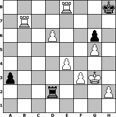 game notation in PGN-format [Event "Wrixum - Open die XII"] [Site "www.myChess.de"] [Date "2014.10.09"] [Round "1"] [White "martinus"] [Black "Master1"] [ECO "A52"] [WhitemyELO "1735"] [BlackmyELO "1286"] [Result "1-0"] [TimeControl "10/2592000"] [WhiteDays "149"] [BlackDays "140"] [MyChessNo "96271"] 1. d4 Nf6 2. c4 e5 3. dxe5 Ng4 4. Qd4 d6 5. exd6 Qxd6 6. Qxd6 Bxd6 7. f3 Bb4+ 8. Bd2 Bxd2+ 9. Nxd2 Ne3 10. Kf2 Nxf1 11. Kxf1 O-O 12. e4 Nc6 13. Ne2 Be6 14. b3 Rad8 15. Rd1 Rd7 16. Nf4 Nd4 17. Kf2 Re8 18. Rhe1 Nc2 19. Rg1 c5 20. Nd5 Nd4 21. g4 b5 22. g5 bxc4 23. bxc4 Bxd5 24. cxd5 Nb5 25. Nc4 Nd6 26. Nxd6 Rxd6 27. Rb1 g6 28. Rb7 a6 29. Rc7 Rb6 30. Rxc5 Rb2+ 31. Kg3 Rxa2 32. Rb1 Kf8 33. Rb7 a5 34. Rcc7 a4 35. Rxf7+ Kg8 36. Rg7+ Kh8 37. Rxh7+ Kg8 38. Rhg7+ Kh8 39. d6 a3 40. Rge7 Rd2 41. Rxe8# 1-0 position notation in FEN-format 4R2k/1R6/3P2p1/6P1/4P3/p4PK1/3r3P/8 - - - 0 41 Captured white pieces: Captured black pieces: Click on a captured piece in order to display the desired move!