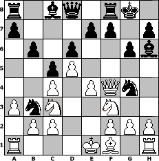 game notation in PGN-format [Event "Herbstturnier"] [Site "www.myChess.de"] [Date "2004.11.18"] [Round "1"] [White "Sanji"] [Black "Chelly"] [ECO "A30"] [WhitemyELO "1735"] [BlackmyELO "1613"] [Result "0-1"] [TimeControl "10/864000"] [WhiteDays "18"] [BlackDays "12"] [MyChessNo "8193"] 1. c4 c5 2. Nf3 Nc6 3. Nc3 g6 4. d4 d6 5. Be3 b6 6. a3 Bg7 7. Qd2 Nf6 8. Bh6 O-O 9. d5 Na5 10. e4 Nb3 11. Qe3 Ng4 12. Qf4 Bxh6 0-1 position notation in FEN-format r1bq1rk1/p3pp1p/1p1p2pb/2pP4/2P1PQn1/PnN2N2/1PP2PPP/R3KB1R - KQ - 0 13 Captured white pieces: Captured black pieces: Click on a captured piece in order to display the desired move!