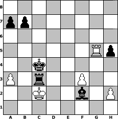 game notation in PGN-format [Event "martinus Open"] [Site "www.myChess.de"] [Date "2010.06.02"] [Round "1"] [White "martinus"] [Black "Lemmi11"] [ECO "C21"] [WhitemyELO "1765"] [BlackmyELO "1772"] [Result "0-1"] [TimeControl "10/1728000"] [WhiteDays "77"] [BlackDays "80"] [MyChessNo "66022"] 1. e4 e5 2. d4 exd4 3. c3 d5 4. e5 dxc3 5. Nxc3 d4 6. Nb5 Nc6 7. Nf3 Bg4 8. Bc4 Nxe5 9. Qe2 f6 10. Bf4 Bxf3 11. gxf3 Qe7 12. O-O-O O-O-O 13. Nxd4 Qe8 14. Qc2 Ne7 15. Ne6 Rxd1+ 16. Rxd1 N7c6 17. Nxc7 Kxc7 18. Bd5 Kb8 19. Kb1 Nb4 20. Qe4 Bc5 21. a3 Nxd5 22. Rxd5 Bxf2 23. Bxe5+ fxe5 24. Rxe5 Qc8 25. Re7 g6 26. Qe5+ Ka8 27. Ka1 Qc1+ 28. Ka2 Qc4+ 29. Kb1 Rd8 30. Qc3 Qxc3 31. bxc3 h5 32. Rg7 Kb8 33. Rxg6 Rd3 34. Rg8+ Kc7 35. Rg7+ Kc6 36. Rg6+ Kd5 37. Rg5+ Kc4 38. Kc2 Rxc3+ 0-1 position notation in FEN-format 8/pp6/8/6Rp/2k5/P1r2P2/2K2b1P/8 - - - 0 39 Captured white pieces: Captured black pieces: Click on a captured piece in order to display the desired move!