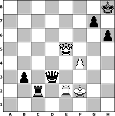 game notation in PGN-format [Event "Ferienspass"] [Site "www.myChess.de"] [Date "2016.07.25"] [Round "1"] [White "martinus"] [Black "Erich"] [ECO "E20"] [WhitemyELO "1784"] [BlackmyELO "2131"] [Result "0-1"] [TimeControl "10/864000"] [WhiteDays "10"] [BlackDays "10"] [MyChessNo "104312"] 1. d4 Nf6 2. c4 e6 3. Nc3 Bb4 4. Bd2 b6 5. a3 Be7 6. e4 Bb7 7. Bd3 d6 8. Nf3 Nbd7 9. O-O O-O 10. Qc2 h6 11. Rfe1 e5 12. d5 Nc5 13. Be2 Ncd7 14. h3 a6 15. Nh4 Nxe4 16. Ng6 Nxc3 17. Nxe7+ Qxe7 18. Bxc3 f5 19. f4 exf4 20. Bd3 Qg5 21. h4 Qxh4 22. Bxf5 Ne5 23. Be6+ Kh8 24. Bxe5 dxe5 25. Rxe5 f3 26. Qf2 Qxc4 27. gxf3 Rad8 28. Qe3 Bxd5 29. b3 Qc6 30. Rc1 Qa8 31. Bxd5 Rxd5 32. Rxc7 Rd1+ 33. Kg2 Qd8 34. Ree7 Rg8 35. Rc2 Rd3 36. Qe4 Rxb3 37. a4 Rd3 38. Re2 Rd4 39. Qg6 Rd5 40. R7e5 b5 41. axb5 axb5 42. Rxd5 Qxd5 43. Kg3 b4 44. f4 b3 45. Qb1 Rb8 46. Qb2 Qd3+ 47. Kf2 Rc8 48. Qe5 Rc2 0-1 position notation in FEN-format 7k/6p1/7p/4Q3/5P2/1p1q4/2r1RK2/8 - - - 8 49 Captured white pieces: Captured black pieces: Click on a captured piece in order to display the desired move!