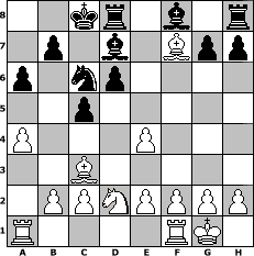 game notation in PGN-format [Event "1600_er unter sich"] [Site "www.myChess.de"] [Date "2005.04.06"] [Round "2"] [White "Andreas"] [Black "Lanzelot"] [ECO "C45"] [WhitemyELO "1619"] [BlackmyELO "1690"] [Result "1-0"] [TimeControl "10/864000"] [WhiteDays "08"] [BlackDays "09"] [MyChessNo "11839"] 1. e4 e5 2. Nf3 Nc6 3. d4 exd4 4. Nxd4 Nxd4 5. Qxd4 c5 6. Qe5+ Qe7 7. Bf4 Qxe5 8. Bxe5 d6 9. Bc3 a6 10. Bc4 Ne7 11. a4 Bd7 12. O-O Nc6 13. Nd2 O-O-O 14. Bxf7 1-0 position notation in FEN-format 2kr1b1r/1p1b1Bpp/p1np4/2p5/P3P3/2B5/1PPNPPPP/R4RK1 - - - 0 14 Captured white pieces: ![]() ![]() ![]() ![]() ![]() ![]() ![]() ![]() ![]() ![]() ![]() ![]() ![]() ![]() ![]() Captured black pieces: ![]() ![]() ![]() ![]() ![]() ![]() ![]() ![]() ![]() ![]() ![]() ![]() ![]() ![]() ![]() Click on a captured piece in order to display the desired move!