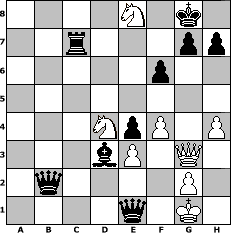 game notation in PGN-format [Event "Der Mai ist gekommen"] [Site "www.myChess.de"] [Date "2007.05.05"] [Round "1"] [White "nogumo"] [Black "GIM1961"] [ECO "A00"] [WhitemyELO "1684"] [BlackmyELO "2034"] [Result "0-1"] [TimeControl "10/2592000"] [WhiteDays "134"] [BlackDays "138"] [MyChessNo "34580"] 1. b4 e5 2. Bb2 Bxb4 3. Bxe5 Nf6 4. Nc3 Be7 5. Nb5 d6 6. Bb2 O-O 7. e3 c6 8. Nc3 d5 9. Nf3 Nbd7 10. Be2 Bd6 11. O-O Qc7 12. h3 Re8 13. Nb1 Ne5 14. Bxe5 Bxe5 15. d4 Bd6 16. c4 Bf5 17. Nbd2 Qe7 18. Nh4 Bd7 19. c5 Bc7 20. Nhf3 b6 21. Nb3 Ne4 22. cxb6 axb6 23. Bd3 c5 24. dxc5 bxc5 25. Bxe4 dxe4 26. Nh2 Bb5 27. Re1 Bd3 28. f4 c4 29. Nd4 Qc5 30. Ng4 Ba5 31. Rc1 Bxe1 32. Qxe1 Rxa2 33. Qg3 Qb6 34. Ne5 Qb2 35. Re1 f6 36. Nf5 Ra7 37. Nc6 Rc7 38. h4 c3 39. Ncd4 c2 40. Nd6 c1=Q 41. Nxe8 Qxe1+ 0-1 position notation in FEN-format 4N1k1/2r3pp/5p2/8/3NpP1P/3bP1Q1/1q4P1/4q1K1 - - - 0 42 Captured white pieces: Captured black pieces: Click on a captured piece in order to display the desired move!