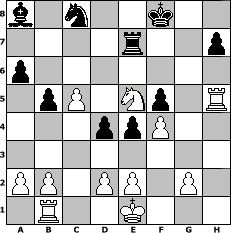 game notation in PGN-format [Event "Wanderpokal November 2006 -"] [Site "www.myChess.de"] [Date "2006.12.01"] [Round "1"] [White "Jolilein"] [Black "YinYang512"] [Variant "Fischerrandom"] [SetUp "1"] [FEN "brnbkrnq/pppppppp/8/8/8/8/PPPPPPPP/BRNBKRNQ w KQkq - 0 1"] [WhitemyELO "1388"] [BlackmyELO "1585"] [Result "1-0"] [TimeControl "10/864000"] [WhiteDays "10"] [BlackDays "08"] [MyChessNo "30670"] 1. b4 e6 2. Nd3 Bf6 3. Nf3 d6 4. c4 Bxa1 5. Rxa1 g6 6. Rb1 e5 7. Nc1 Nge7 8. Ba4+ c6 9. Bb3 O-O 10. h4 b5 11. c5 dxc5 12. bxc5 e4 13. Qh2 Rb7 14. Ng5 Qd4 15. h5 Rd7 16. Nd3 Nd5 17. hxg6 fxg6 18. Ne6 Qf6 19. Nxf8 Kxf8 20. Ne5 Re7 21. f4 a6 22. Bxd5 cxd5 23. Qh3 Qf5 24. Qxf5+ gxf5 25. Rh1 d4 26. Rh5 1-0 position notation in FEN-format b1n2k2/4r2p/p7/1pP1Np1R/3ppP2/8/PP1PP1P1/1R2K3 - - - 1 26 Captured white pieces: Captured black pieces: Click on a captured piece in order to display the desired move!