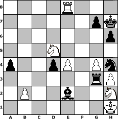 game notation in PGN-format [Event "!!!Turnier in den Sommer!!!"] [Site "www.myChess.de"] [Date "2011.03.02"] [Round "1"] [White "muetoe"] [Black "Holzhacker"] [ECO "B42"] [WhitemyELO "1828"] [BlackmyELO "2065"] [Result "0-1"] [TimeControl "10/1728000"] [WhiteDays "48"] [BlackDays "83"] [MyChessNo "72483"] 1. e4 c5 2. Nf3 e6 3. d4 cxd4 4. Nxd4 a6 5. Bd3 Bc5 6. Nb3 Ba7 7. O-O Ne7 8. c4 d6 9. Nc3 O-O 10. Qe2 Nbc6 11. Be3 e5 12. Bxa7 Rxa7 13. Rfd1 b6 14. Qe3 f5 15. Na4 Rb7 16. c5 bxc5 17. Bc4+ Kh8 18. Naxc5 Rb4 19. Rac1 a5 20. a3 Rb8 21. a4 Rf6 22. exf5 Nxf5 23. Qd3 Rf8 24. Ne4 Ncd4 25. Bb5 Nxb5 26. axb5 a4 27. Nbd2 Bd7 28. Nf3 Bxb5 29. Qd2 Be8 30. Neg5 Qf6 31. Rc3 Bh5 32. Re1 h6 33. Ne4 Qg6 34. h3 Rb4 35. Nh2 Rd4 36. Qc2 Nh4 37. g4 d5 38. Rc8 Rxc8 39. Qxc8+ Qe8 40. Qxe8+ Bxe8 41. Nc3 e4 42. f3 Rd2 43. Re2 Rd3 44. fxe4 d4 45. Nd5 Rg3+ 46. Kh1 Bb5 47. Rc2 Bd3 48. Rc8+ Kh7 49. Re8 Be2 0-1 position notation in FEN-format 4R3/6pk/7p/3N4/p2pP1Pn/6rP/1P2b2N/7K - - - 10 50 Captured white pieces: ![]() ![]() ![]() ![]() ![]() ![]() ![]() ![]() ![]() ![]() ![]() ![]() ![]() ![]() ![]() Captured black pieces: ![]() ![]() ![]() ![]() ![]() ![]() ![]() ![]() ![]() ![]() ![]() ![]() ![]() ![]() ![]() Click on a captured piece in order to display the desired move!