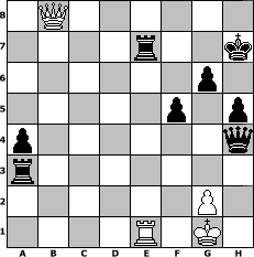 | game notation in PGN-format [Event "Mit freude am Spiel die 3te!!"] [Site "www.myChess.de"] [Date "2017.10.26"] [Round "1"] [White "miu"] [Black "Rabenvogel"] [ECO "D02"] [WhitemyELO "1561"] [BlackmyELO "1537"] [Result "0-1"] [TimeControl "10/1728000"] [WhiteDays "20"] [BlackDays "20"] [MyChessNo "110129"] 1. d4 d5 2. Nf3 Nc6 3. Bf4 Bg4 4. e3 a6 5. Be2 Bxf3 6. Bxf3 e6 7. O-O h6 8. Be2 Bd6 9. Bxd6 Qxd6 10. Nd2 Nf6 11. a3 O-O 12. c4 Qd7 13. Rc1 Ne7 14. Re1 c6 15. Bd3 b5 16. cxd5 exd5 17. Rc3 Qd6 18. f3 Rac8 19. Nb3 Qd8 20. Nc5 Ra8 21. b4 Qc8 22. Bb1 a5 23. Qc2 a4 24. e4 dxe4 25. fxe4 g6 26. Ba2 Nd7 27. Rf1 Nxc5 28. bxc5 Kg7 29. Rcf3 f5 30. d5 cxd5 31. Qc3+ Kh7 32. exd5 Qd8 33. d6 Nc6 34. Bd5 Ra6 35. Bxc6 Rxc6 36. Qb4 Qb8 37. Re3 Rf7 38. Rb1 Qa7 39. Re5 Rxd6 40. Kf1 Rdd7 41. Rbe1 h5 42. h4 Rd3 43. Re8 Qd7 44. Qb2 Qd4 45. Qxb5 Rxa3 46. Qb8 Qc4+ 47. Kg1 Qxc5+ 48. Kh1 Qd4 49. R8e7 Qxh4+ 50. Kg1 Rxe7 0-1 position notation in FEN-format 1Q6/4r2k/6p1/5p1p/p6q/r7/6P1/4R1K1 - - - 0 51 Captured white pieces:                              Captured black pieces:                               Click on a captured piece in order to display the desired move!