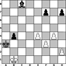 game notation in PGN-format [Event "In Memorium Michael Knopf 4"] [Site "www.myChess.de"] [Date "2015.04.10"] [Round "1"] [White "miu"] [Black "pepo47"] [ECO "C68"] [WhitemyELO "1590"] [BlackmyELO "2077"] [Result "0-1"] [TimeControl "10/2592000"] [WhiteDays "120"] [BlackDays "112"] [MyChessNo "98934"] 1. e4 e5 2. Nf3 Nc6 3. Bb5 a6 4. Bxc6 dxc6 5. O-O Be7 6. d4 exd4 7. Qxd4 Qxd4 8. Nxd4 Bd7 9. Nc3 O-O-O 10. Be3 Nf6 11. f3 b6 12. a3 Kb7 13. Nde2 Bc8 14. Rad1 Nd7 15. b4 Ne5 16. Rxd8 Rxd8 17. Rd1 Rxd1+ 18. Nxd1 Nc4 19. Bc1 c5 20. c3 cxb4 21. axb4 c5 22. Nb2 Nxb2 23. Bxb2 cxb4 24. cxb4 Bxb4 25. Bxg7 a5 26. Kf1 a4 27. Ba1 Kc6 28. Nd4+ Kc5 29. Ke2 Kc4 30. Kd1 Bc3 31. Bxc3 Kxc3 32. Nb5+ Kb2 33. g4 a3 34. Nxa3 Kxa3 35. Kc2 b5 36. Kb1 b4 0-1 position notation in FEN-format 2b5/5p1p/8/8/1p2P1P1/k4P2/7P/1K6 - - - 0 37 Captured white pieces: ![]() ![]() ![]() ![]() ![]() ![]() ![]() ![]() ![]() ![]() ![]() ![]() ![]() ![]() ![]() Captured black pieces: ![]() ![]() ![]() ![]() ![]() ![]() ![]() ![]() ![]() ![]() ![]() ![]() ![]() ![]() ![]() Click on a captured piece in order to display the desired move!