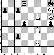game notation in PGN-format [Event "2016"] [Site "www.myChess.de"] [Date "2016.01.01"] [Round "1"] [White "S04boy"] [Black "Master1"] [ECO "A46"] [WhitemyELO "1235"] [BlackmyELO "1255"] [Result "1-0"] [TimeControl "10/2592000"] [WhiteDays "29"] [BlackDays "29"] [MyChessNo "101932"] 1. d4 Nf6 2. Nf3 d5 3. Bf4 Nc6 4. e3 Bf5 5. Bb5 e6 6. Bxc6+ bxc6 7. Nc3 Bd6 8. Bg5 h6 9. Bxf6 Qxf6 10. Qe2 Bg4 11. h3 Bxf3 12. gxf3 Bb4 13. a3 Bxc3+ 14. bxc3 O-O 15. Rg1 e5 16. e4 exd4 17. e5 Qe6 18. cxd4 Qxh3 19. O-O-O Qe6 20. f4 Qe7 21. Qg4 f6 22. Rde1 Qxa3+ 23. Kd2 Rf7 24. exf6 Qf8 25. Qe6 Qb4+ 26. c3 Qb2+ 27. Kd3 Qb5+ 28. Ke3 c5 29. Rxg7+ Kh8 30. Qxf7 cxd4+ 31. Kf3 Qd3+ 32. Kg4 h5+ 33. Kg5 dxc3 34. Re8+ Rxe8 35. Kh6 Rd8 36. Rh7+ Qxh7+ 37. Qxh7# 1-0 position notation in FEN-format 3r3k/p1p4Q/5P1K/3p3p/5P2/2p5/5P2/8 - - - 0 37 Captured white pieces: Captured black pieces: Click on a captured piece in order to display the desired move!