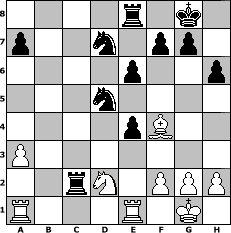 game notation in PGN-format [Event "MySchachOpen"] [Site "www.myChess.de"] [Date "2005.01.22"] [Round "2"] [White "Knight"] [Black "Pinguin"] [ECO "A45"] [WhitemyELO "1152"] [BlackmyELO "1502"] [Result "0-1"] [TimeControl "10/2592000"] [WhiteDays "88"] [BlackDays "84"] [MyChessNo "9898"] 1. d4 Nf6 2. Nc3 d5 3. Bf4 e6 4. e3 Bb4 5. Bb5+ Bd7 6. Bxd7+ Nbxd7 7. Nge2 O-O 8. O-O h6 9. a3 Bxc3 10. Nxc3 c5 11. Bd6 Re8 12. dxc5 b6 13. cxb6 Qxb6 14. Bf4 Qxb2 15. Na4 Qb5 16. Nc3 Qa5 17. Qd2 Rac8 18. Nb1 Qxd2 19. Nxd2 Rxc2 20. e4 dxe4 21. Rfe1 Nd5 0-1 position notation in FEN-format 4r1k1/p2n1pp1/4p2p/3n4/4pB2/P7/2rN1PPP/R3R1K1 - - - 2 22 Captured white pieces: Captured black pieces: Click on a captured piece in order to display the desired move!