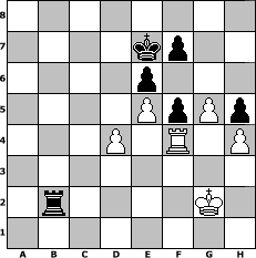 game notation in PGN-format [Event "Sommer 2010 Teil 2"] [Site "www.myChess.de"] [Date "2010.06.24"] [Round "1"] [White "kischok46"] [Black "deepsabel"] [ECO "A06"] [WhitemyELO "2047"] [BlackmyELO "2021"] [Result "1/2-1/2"] [TimeControl "10/1728000"] [WhiteDays "87"] [BlackDays "88"] [MyChessNo "66492"] 1. Nf3 d5 2. d4 Nf6 3. c4 e6 4. Nc3 c6 5. e3 Nbd7 6. Bd3 dxc4 7. Bxc4 b5 8. Bd3 Bb7 9. e4 b4 10. Na4 c5 11. e5 Nd5 12. Nxc5 Nxc5 13. dxc5 Bxc5 14. O-O h6 15. Qa4+ Ke7 16. Ba6 Qb6 17. Bxb7 Qxb7 18. Qc2 Rhc8 19. Qh7 Rh8 20. Qe4 Rhd8 21. Be3 Bxe3 22. fxe3 Qb6 23. Rae1 Kf8 24. g4 g6 25. g5 h5 26. Nd2 Rd7 27. Nc4 Qc5 28. Rf3 Kg7 29. Ref1 Rf8 30. Nd6 Rc7 31. Kh1 a5 32. h3 a4 33. Qd4 Qxd4 34. exd4 Rc2 35. R1f2 Rxf2 36. Rxf2 Ne3 37. h4 Nf5 38. Nxf5+ gxf5 39. Rc2 b3 40. axb3 axb3 41. Rc3 Rd8 42. Rd3 Rc8 43. Rxb3 Rc2 44. Kg1 Re2 45. Rf3 Rxb2 46. Rf2 Rb4 47. Rf4 Kf8 48. Kf2 Ke7 49. Kf3 Rb3+ 50. Kg2 Rb2+ 1/2-1/2 position notation in FEN-format 8/4kp2/4p3/4PpPp/3P1R1P/8/1r4K1/8 - - - 10 51 Captured white pieces: ![]() ![]() ![]() ![]() ![]() ![]() ![]() ![]() ![]() ![]() ![]() ![]() ![]() ![]() ![]() Captured black pieces: ![]() ![]() ![]() ![]() ![]() ![]() ![]() ![]() ![]() ![]() ![]() ![]() ![]() ![]() ![]() Click on a captured piece in order to display the desired move!