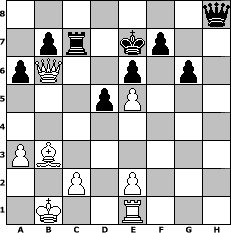 game notation in PGN-format [Event "Bremer Schl"] [Site "www.myChess.de"] [Date "2010.10.15"] [Round "1"] [White "dbuse"] [Black "HenrySchinasky"] [ECO "B75"] [WhitemyELO "2123"] [BlackmyELO "2139"] [Result "1-0"] [TimeControl "10/3456000"] [WhiteDays "115"] [BlackDays "160"] [MyChessNo "68984"] 1. e4 c5 2. Nf3 d6 3. d4 cxd4 4. Nxd4 Nf6 5. Nc3 g6 6. Be3 Bg7 7. f3 Nc6 8. Qd2 O-O 9. Bc4 Bd7 10. O-O-O Rc8 11. Bb3 Ne5 12. Kb1 a6 13. h4 h5 14. g4 hxg4 15. h5 Nxh5 16. Rdg1 Qa5 17. Bh6 Bf6 18. fxg4 Bxg4 19. Bf4 Nxf4 20. Qxf4 Rxc3 21. bxc3 Qxc3 22. Qh6 Re8 23. Rxg4 e6 24. Rf4 Nc4 25. Bxc4 Qxd4 26. Rxf6 Qxf6 27. a3 Qe5 28. Bb3 Re7 29. Qh7+ Kf8 30. Rd1 Rd7 31. Rf1 Qg7 32. Qh2 Ke7 33. Qf2 Rc7 34. e5 d5 35. Re1 Qh8 36. Qb6 1-0 position notation in FEN-format 7q/1pr1kp2/pQ2p1p1/3pP3/8/PB6/2P1P3/1K2R3 - - - 3 36 Captured white pieces: ![]() ![]() ![]() ![]() ![]() ![]() ![]() ![]() ![]() ![]() ![]() ![]() ![]() ![]() ![]() Captured black pieces: ![]() ![]() ![]() ![]() ![]() ![]() ![]() ![]() ![]() ![]() ![]() ![]() ![]() ![]() ![]() Click on a captured piece in order to display the desired move!
