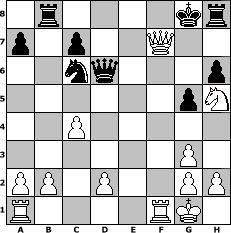 game notation in PGN-format [Event "Abermals Aljechin"] [Site "www.myChess.de"] [Date "2011.02.13"] [Round "2"] [White "kari6katz"] [Black "Joschi"] [ECO "A52"] [WhitemyELO "1796"] [BlackmyELO "1447"] [Result "1-0"] [TimeControl "10/1728000"] [WhiteDays "60"] [BlackDays "47"] [MyChessNo "72001"] 1. d4 Nf6 2. c4 e5 3. dxe5 Ng4 4. e4 d6 5. exd6 Bxd6 6. Be2 Nf6 7. Nc3 O-O 8. Nf3 Nc6 9. O-O Ne5 10. Bg5 h6 11. Bh4 g5 12. Bg3 Nxf3+ 13. Bxf3 Bxg3 14. fxg3 Be6 15. e5 Nd7 16. Bxb7 Rb8 17. Bd5 Nxe5 18. Qd4 Nc6 19. Qc5 Bxd5 20. Nxd5 Qd6 21. Nf6+ Kg7 22. Qf5 Rh8 23. Nh5+ Kg8 24. Qxf7# 1-0 position notation in FEN-format 1r4kr/p1p2Q2/2nq3p/6pN/2P5/6P1/PP1P2PP/R4RK1 - - - 0 24 Captured white pieces: Captured black pieces: Click on a captured piece in order to display the desired move!