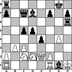 game notation in PGN-format [Event "November-Open (4)"] [Site "www.myChess.de"] [Date "2008.10.26"] [Round "1"] [White "DreiZweiEinsSchach"] [Black "muetoe"] [ECO "B10"] [WhitemyELO "1138"] [BlackmyELO "1946"] [Result "0-1"] [TimeControl "10/1728000"] [WhiteDays "14"] [BlackDays "18"] [MyChessNo "49083"] 1. e4 c6 2. Bc4 d5 3. exd5 cxd5 4. Bb5+ Nc6 5. d4 Nf6 6. Nf3 Bg4 7. O-O e6 8. Qd3 Bd6 9. Bg5 O-O 10. Bxc6 bxc6 11. Ne5 Bf5 12. Qa6 Qc7 13. Bxf6 gxf6 14. Nf3 e5 15. dxe5 fxe5 16. c3 Bd7 17. Nbd2 e4 18. Nd4 c5 19. Nc2 Bxh2+ 20. Kh1 Rfb8 21. b3 Rb6 22. Qe2 Rh6 23. g4 Bg1+ 0-1 position notation in FEN-format r5k1/p1qb1p1p/7r/2pp4/4p1P1/1PP5/P1NNQP2/R4RbK - - - 1 24 Captured white pieces: Captured black pieces: Click on a captured piece in order to display the desired move!