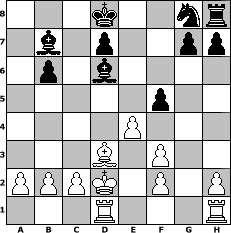 game notation in PGN-format [Event "Schwedisches Schlagen (Kubb)"] [Site "www.myChess.de"] [Date "2006.03.20"] [Round "1"] [White "Andreas"] [Black "Zoidberg"] [ECO "A40"] [WhitemyELO "1574"] [BlackmyELO "1882"] [Result "1/2-1/2"] [TimeControl "10/864000"] [WhiteDays "15"] [BlackDays "19"] [MyChessNo "23779"] 1. d4 e5 2. dxe5 Nc6 3. Nf3 Qe7 4. Bf4 Qb4+ 5. Nc3 Qxf4 6. Nd5 Qf5 7. Nxc7+ Kd8 8. Nxa8 Nxe5 9. e3 Nxf3+ 10. gxf3 b6 11. e4 Qa5+ 12. Qd2 Qxd2+ 13. Kxd2 Bb7 14. Nxb6 axb6 15. Rd1 f5 16. Bd3 Bd6 1/2-1/2 position notation in FEN-format 3k2nr/1b1p2pp/1p1b4/5p2/4P3/3B1P2/PPPK1P1P/3R3R - - - 2 17 Captured white pieces: Captured black pieces: Click on a captured piece in order to display the desired move!